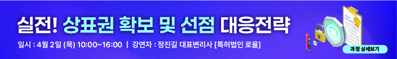 - 04/02실전! 상표권 확보 및 선점 대응전략정진길 대표변리사 / 목, 10:00~16:00 | 총 1일 5시간